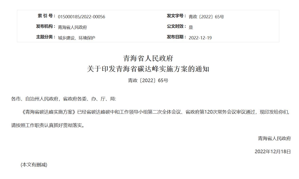 12月19日,青海省人民政府發布關于印發青海省碳達峰實施方案的通知