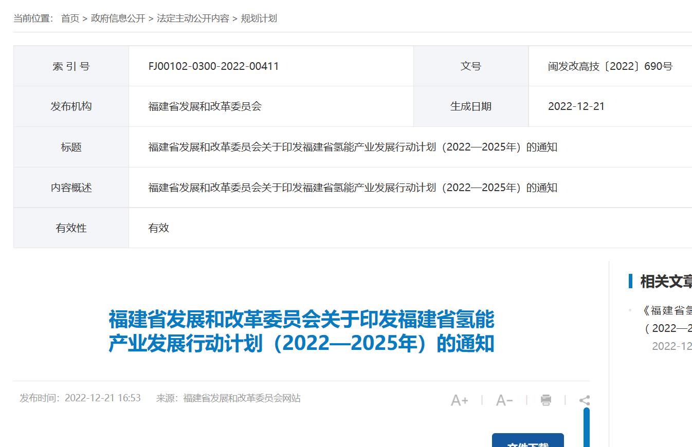 氫啟未來網獲悉,12月21日,福建省發展和改革委員會發布了關于印發《福建省氫能產業發展行動計劃(2022-2025年)》的通知。