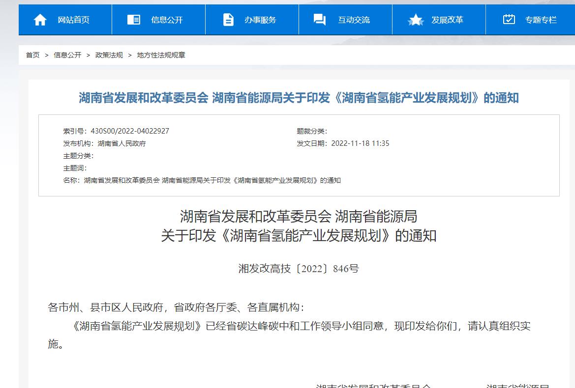 氫啟未來網獲悉,11月18日,湖南省發展和改革委員會、湖南省能源局聯合印發《湖南省氫能產業發展規劃》