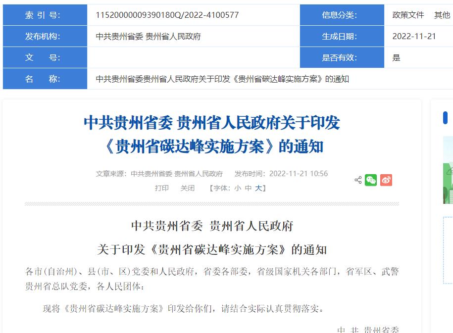 氫啟未來網獲悉,11月21日,貴州省人民政府發布《貴州省碳達峰實施方案》