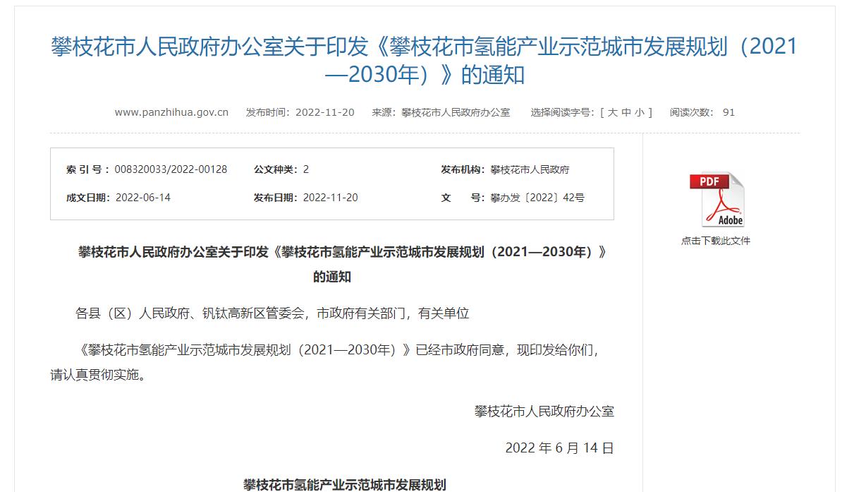 氫啟未來網獲悉,11月20日,攀枝花市人民政府發布《攀枝花市氫能產業示范城市發展規劃(2021-2030年)》