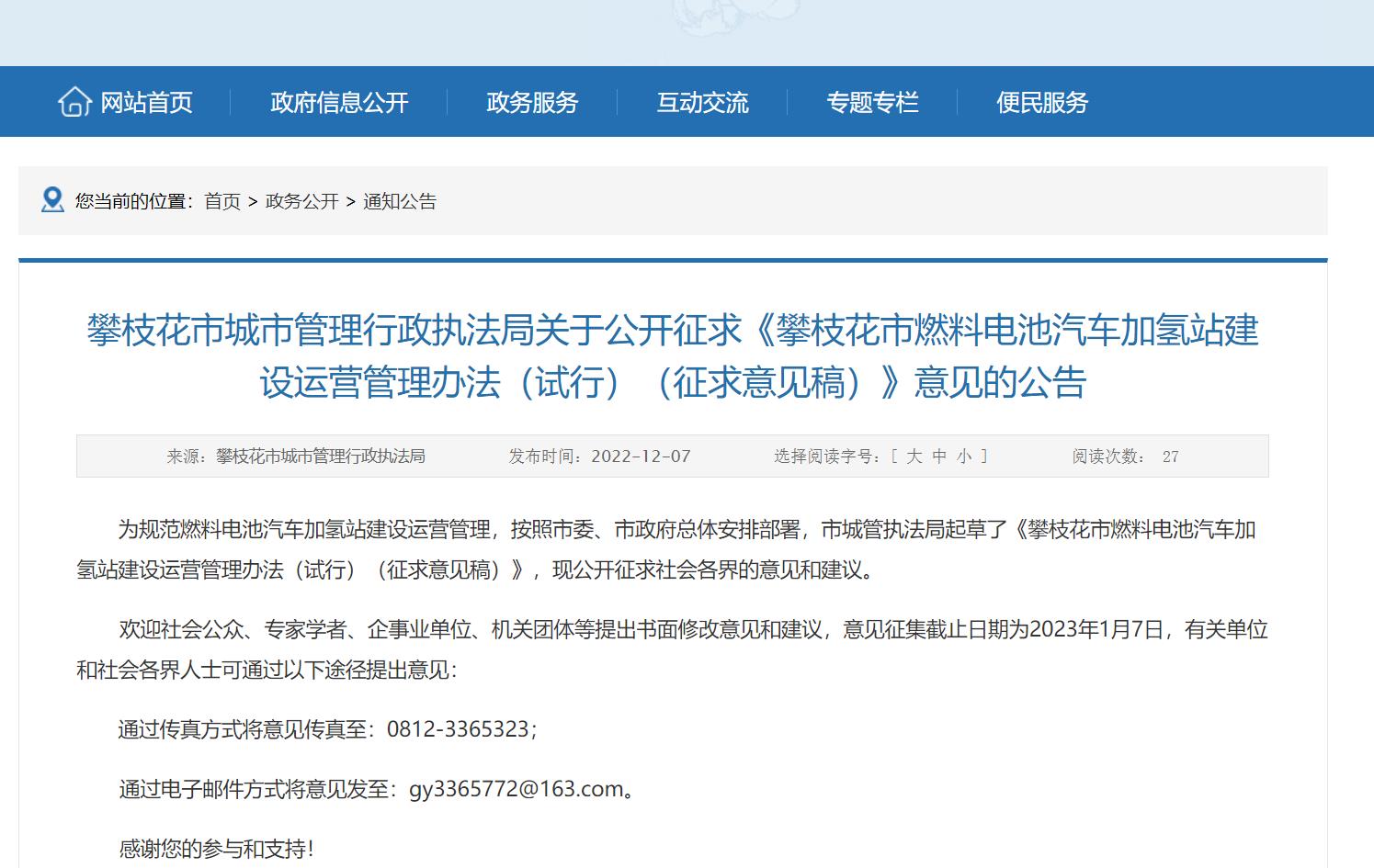 12月7日,攀枝花市城市管理行政執法局發布《攀枝花市燃料電池汽車加氫站建設運營管理辦法(試行)(征求意見稿)》