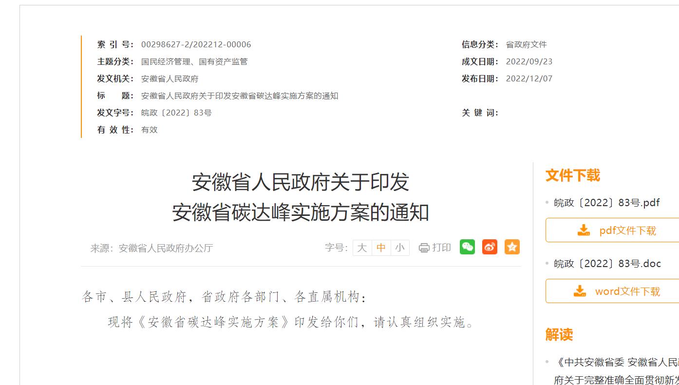 12月7日,安徽省人民政府發布關于印發安徽省碳達峰實施方案的通知