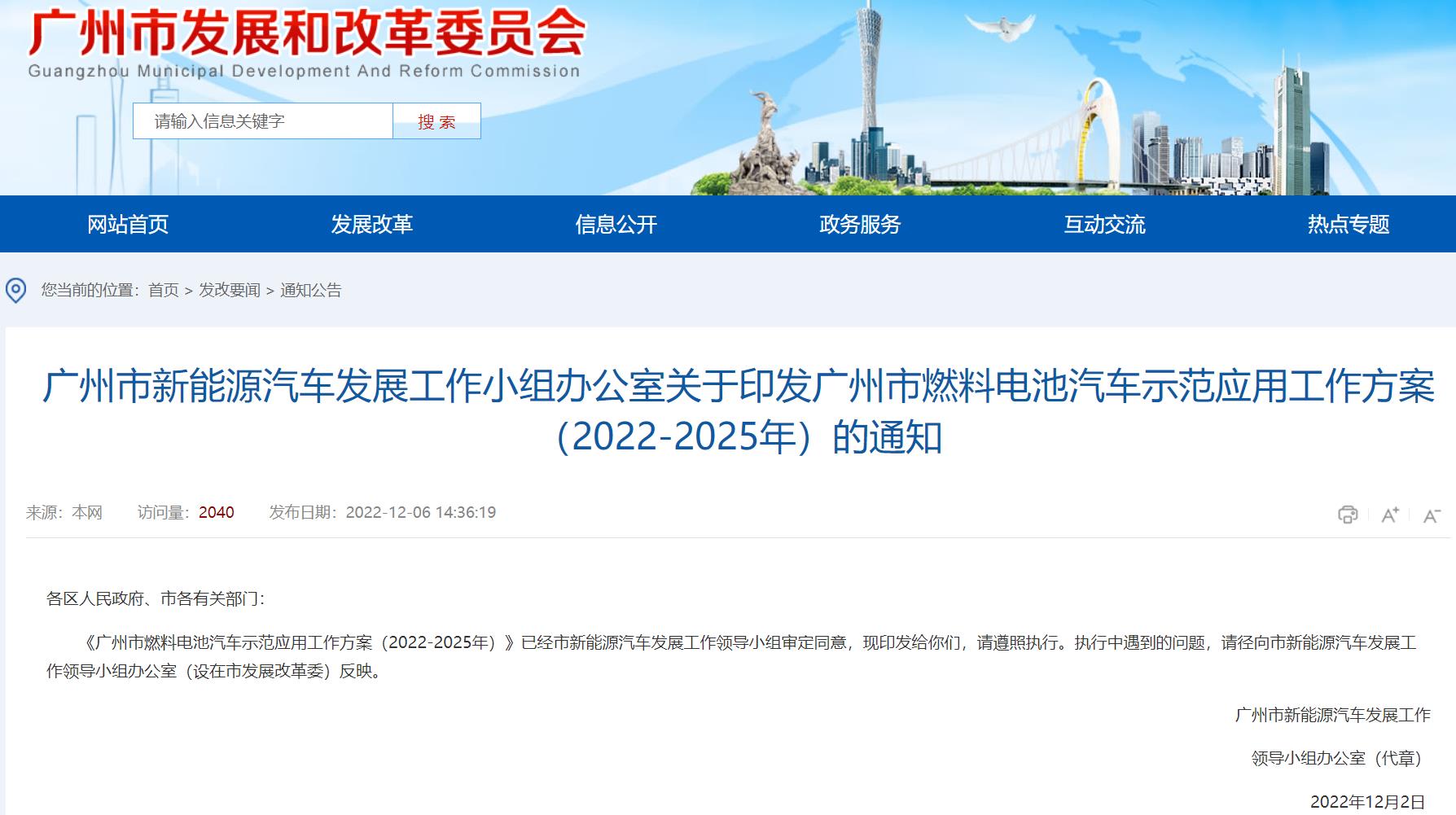 氫啟未來網獲悉,12月6日,廣州市發改委發布廣州市新能源汽車發展工作小組辦公室關于印發廣州市燃料電池汽車示范應用工作方案(2022-2025年)的通知