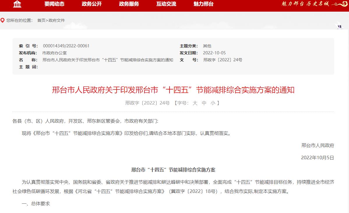 10月5日,邢臺市人民政府發(fā)布關(guān)于印發(fā)邢臺市“十四五”節(jié)能減排綜合實施方案的通知