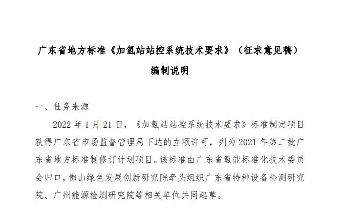 廣東發布《加氫站站控系統技術要求》、《燃料電池電動汽車車載供氫系統檢測置換技術要求》兩項地方標準征求意見通知,本文為附件《加氫站站控系統技術要求編制說明》詳細內容