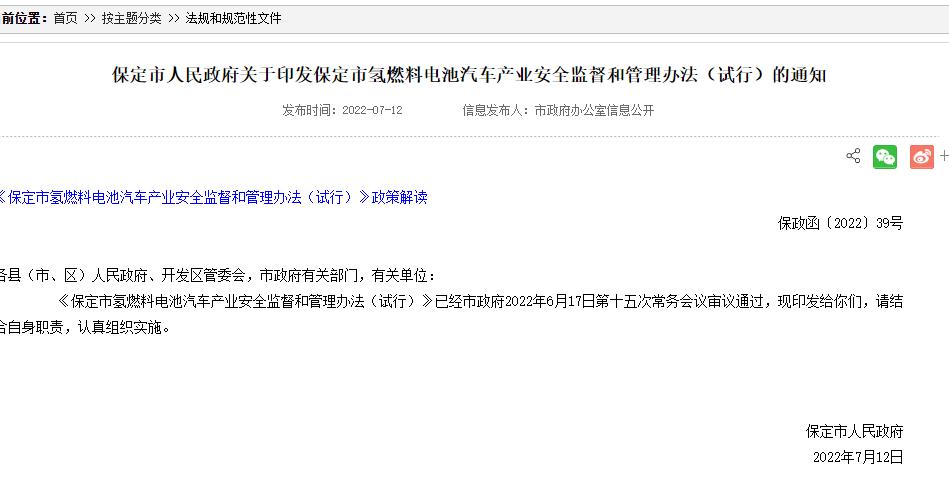 《保定市氫燃料電池汽車產業安全監督和管理辦法(試行)》政策解讀