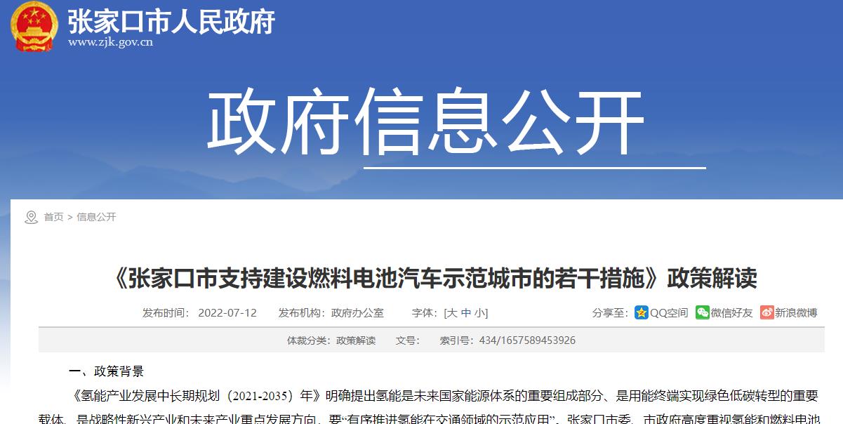 氫啟未來網獲悉,7月12日張家口市人民政府官網發布《張家口市支持建設燃料電池汽車示范城市的若干措施》政策解讀
