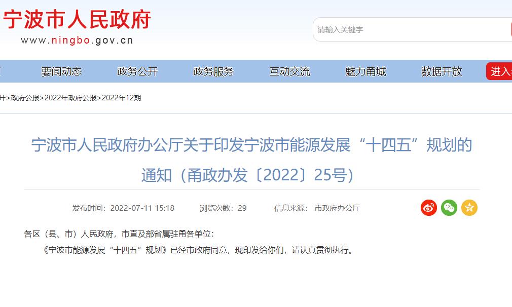 氫啟未來網消息,7月11日,寧波市人民政府在其官網發布關于印發寧波市能源發展“十四五”規劃的通知