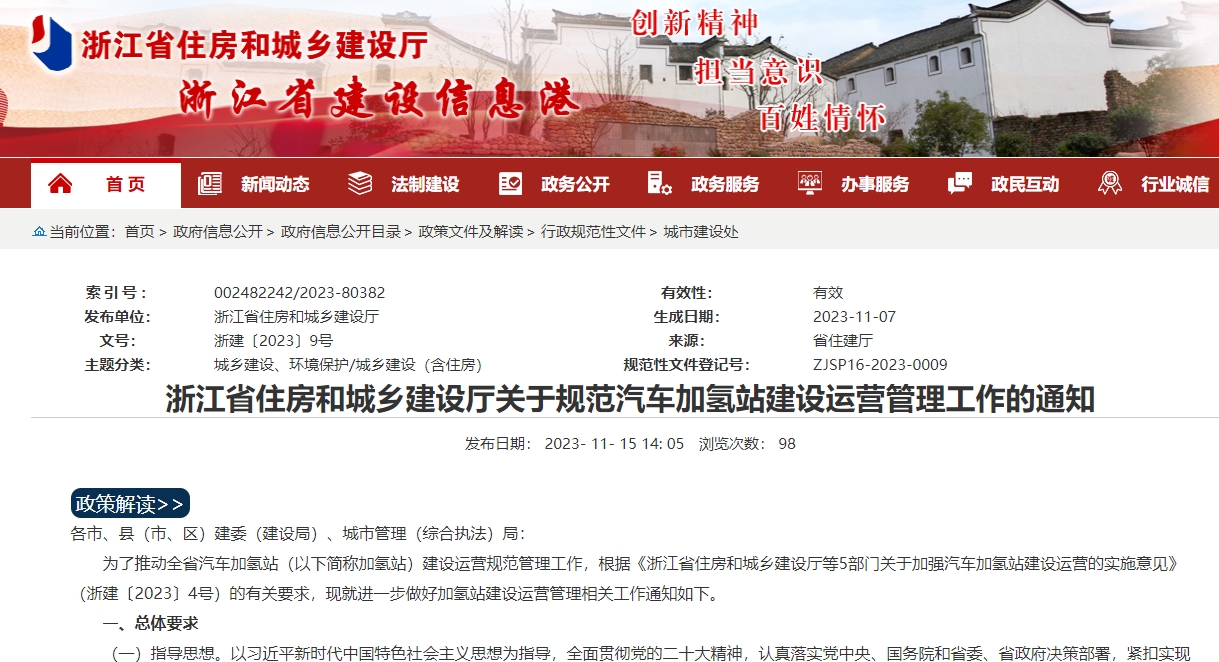 11月15日,為了推動(dòng)浙江省汽車加氫站建設(shè)運(yùn)營規(guī)范管理工作,根據(jù)《浙江省住房和城鄉(xiāng)建設(shè)廳等5部門關(guān)于加強(qiáng)汽車加氫站建設(shè)運(yùn)營的實(shí)施意見》(浙建〔2023〕4號(hào))的有關(guān)要求,浙江省住房和城鄉(xiāng)建設(shè)廳在其官方發(fā)布了《浙江省住房和城鄉(xiāng)建設(shè)廳關(guān)于規(guī)范汽車加氫站建設(shè)運(yùn)營管理工作的通知》