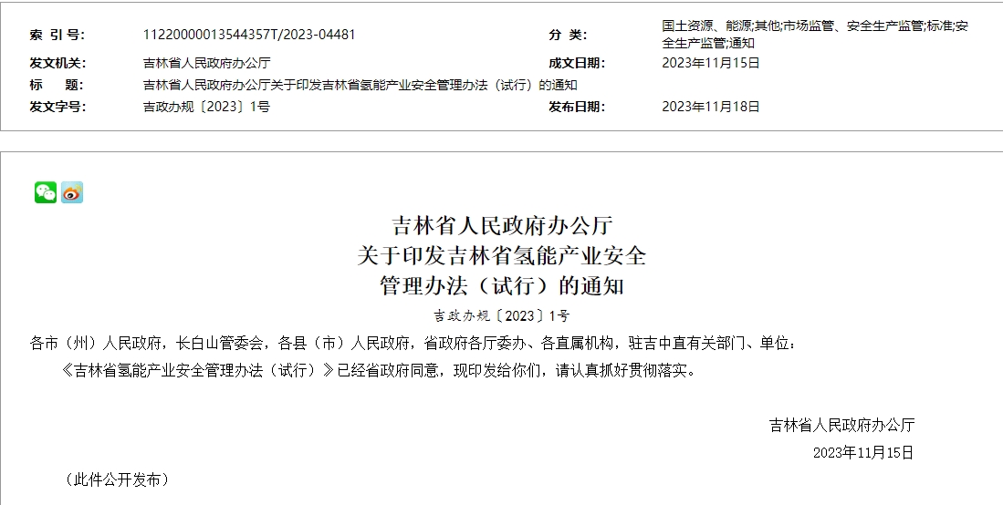 氫啟未來網(wǎng)獲悉,11月18日,吉林省人民政府辦公廳發(fā)布關(guān)于印發(fā)《吉林省氫能產(chǎn)業(yè)安全管理辦法(試行)》的通知。