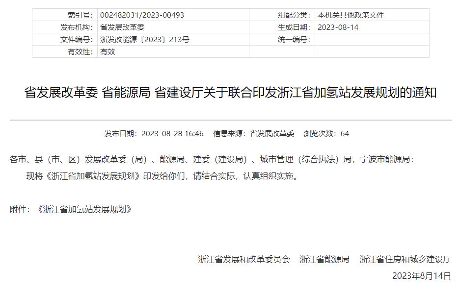 氫啟未來網獲悉,8月28日,浙江省發展和改革委員會、浙江省能源局、浙江省住房和城鄉建設廳聯合印發《浙江省加氫站發展規劃》(以下簡稱:規劃)。