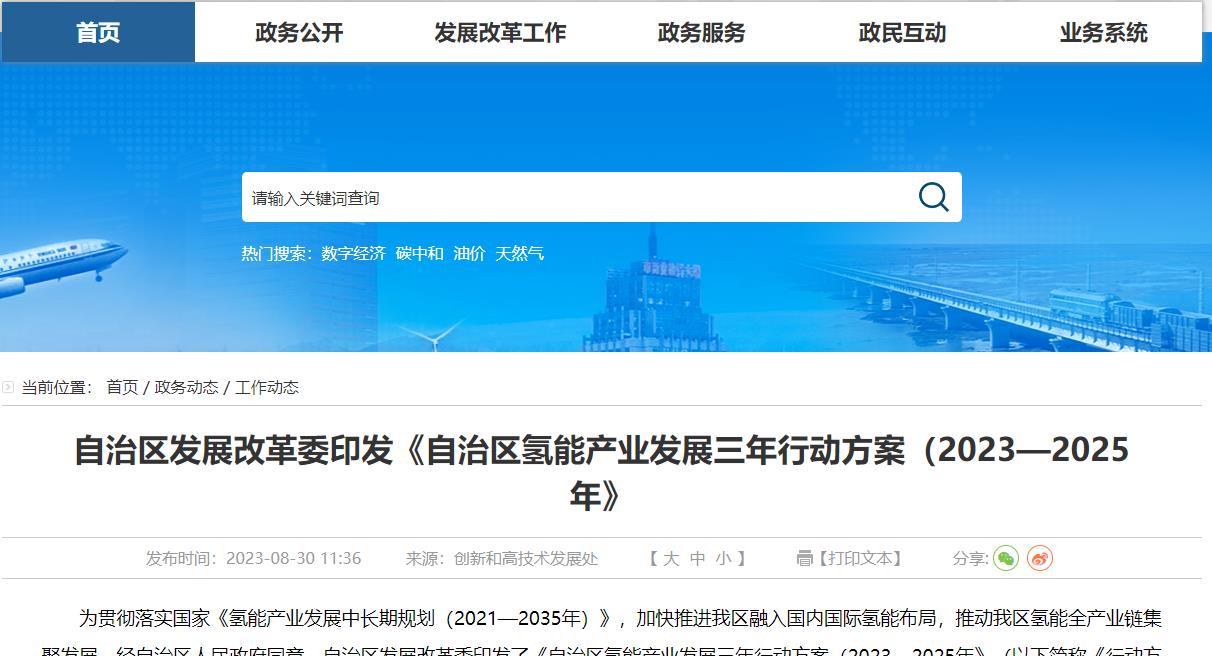 氫啟未來網8月30日消息,新疆維吾爾自治區發展和改革委員會發布關于自治區發展改革委印發《自治區氫能產業發展三年行動方案(2023-2025年)》(以下簡稱:行動方案)的消息。