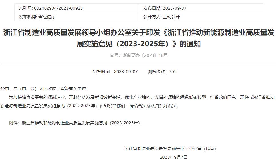 《浙江省推動新能源制造業高質量發展實施意見(2023-2025年)》