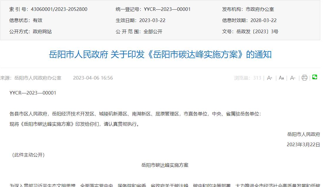 氫啟未來網獲悉,4月6日,岳陽市人民政府辦公室發布關于印發《岳陽市碳達峰實施方案》的通知