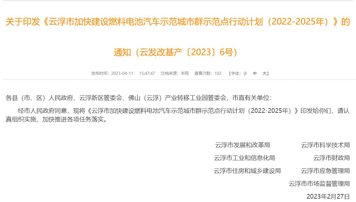 氫啟未來網獲悉,4月11日,云浮市發展和改革局等7部門聯合印發《云浮市加快建設燃料電池汽車示范城市群示范點行動計劃(2022-2025年)》。