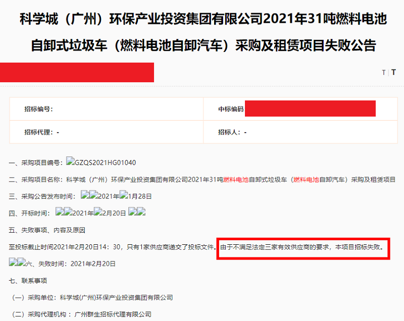 ?2021年2月20日,科學城(廣州)環保產業投資集團有限公司的500輛31噸燃料電池自卸式垃圾車采購及租賃項目,因只有1家供應商提供了投標文件,不滿足法定要求,公告失敗。