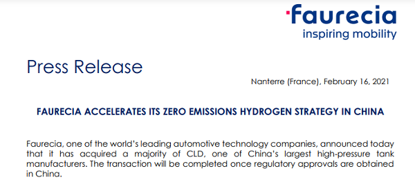 ?2月16日,佛吉亞(FAURECIA)宣布已收購中國最大高壓氣瓶公司斯林達(CLD)大部分股權(quán),交易將在獲得相關(guān)部門審批后完成。截止目前,雙方并未透露具體的收購金額。根據(jù)了解,此次收購為絕對控股,雙方將為中國市場開發(fā)生產(chǎn)III型和IV型儲氫罐。