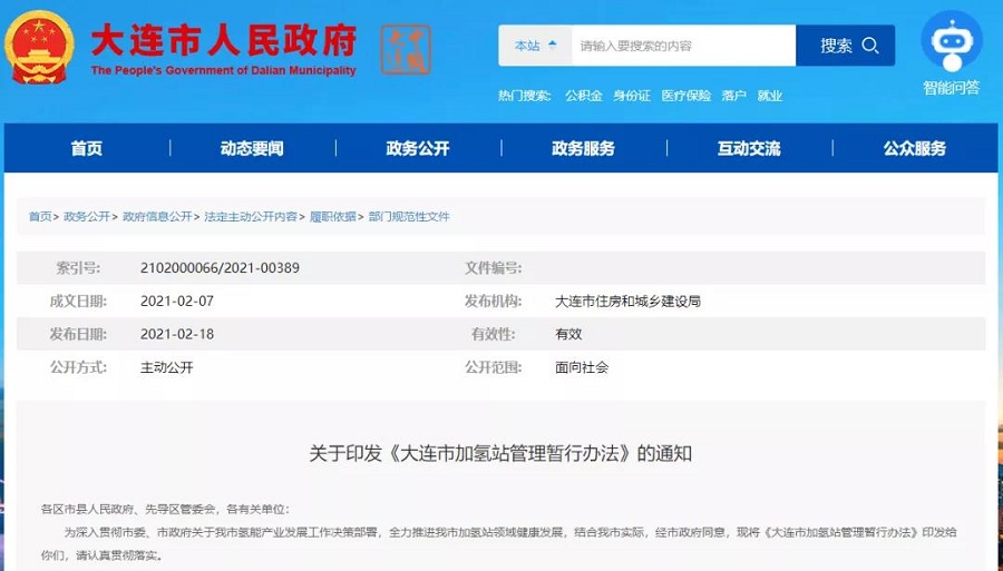 ?2月17日,大連市人民政府發(fā)布關(guān)于印發(fā)《大連市加氫站管理暫行辦法》的通知,有效期兩年。其中規(guī)定加氫站建設(shè)由大連市住房和城鄉(xiāng)建設(shè)管理局主管。