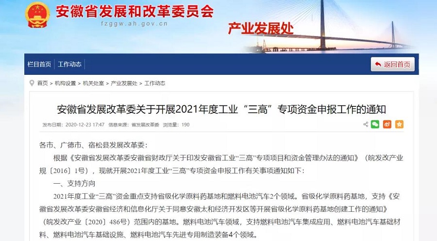 合肥發(fā)改委公示信息顯示,近日,合肥市發(fā)改委正式對(duì)外發(fā)布關(guān)于開(kāi)展2021年度省工業(yè)“三高”項(xiàng)目申報(bào)工作的通知,支持燃料電池汽車集成應(yīng)用領(lǐng)域;燃料電池汽車基礎(chǔ)材料領(lǐng)域;燃料電池汽車基礎(chǔ)設(shè)施領(lǐng)域;燃料電池汽車先進(jìn)專用制造裝備領(lǐng)域這4個(gè)領(lǐng)域19個(gè)方向的申報(bào)。
