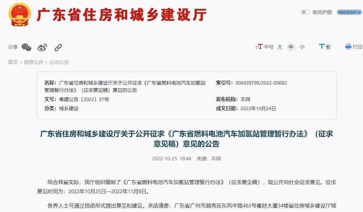 氫啟未來網獲悉,10月25日,結合廣東省實際情況,廣東省住房和城鄉建設廳發布關于公開征求《廣東省燃料電池汽車加氫站管理暫行辦法》(征求意見稿)意見的公告