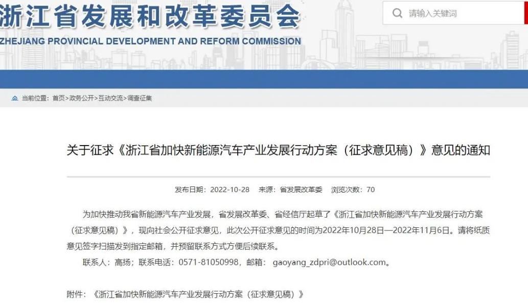氫啟未來網獲悉,10月28日,為加快推動浙江省新能源汽車產業發展,浙江省發展改革委發布關于征求《浙江省加快新能源汽車產業發展行動方案(征求意見稿)》意見的通知。