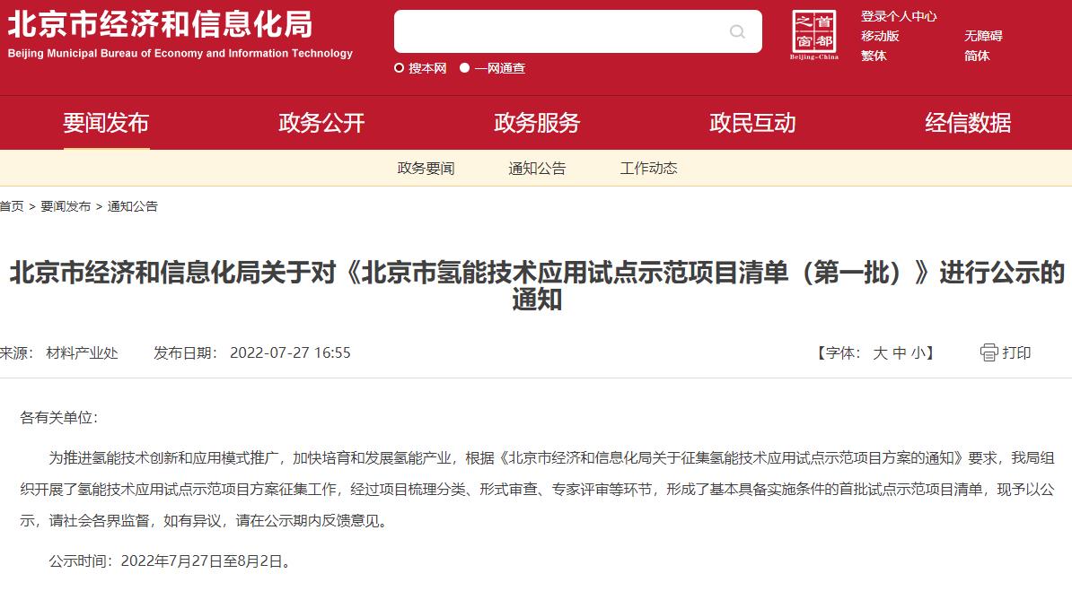 氫啟未來網獲悉,7月27日,北京市經信局對《北京市氫能技術應用試點示范項目清單(第一批)》進行公示通知
