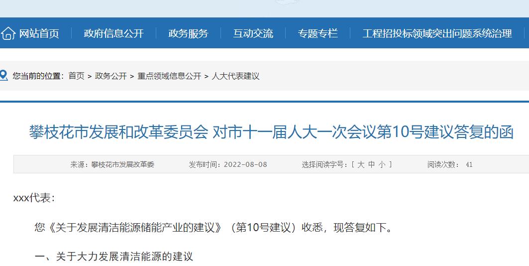 您《關于發展清潔能源儲能產業的建議》收悉,現答復如下。2021年,攀枝花市發展改革委委托相關機構,編制了《攀枝花市清潔能源中長期發展規劃》,對水能、太陽能、風能、生物質能、氫能的資源量進行了分析,促進“水風光氫儲”五位一體、多能互補、協調發展,確定了具體發展目標,預計到2030年,攀枝花水電裝機661萬千瓦,光伏發電裝機提升至450萬千瓦,風電裝機提升至250萬千瓦。