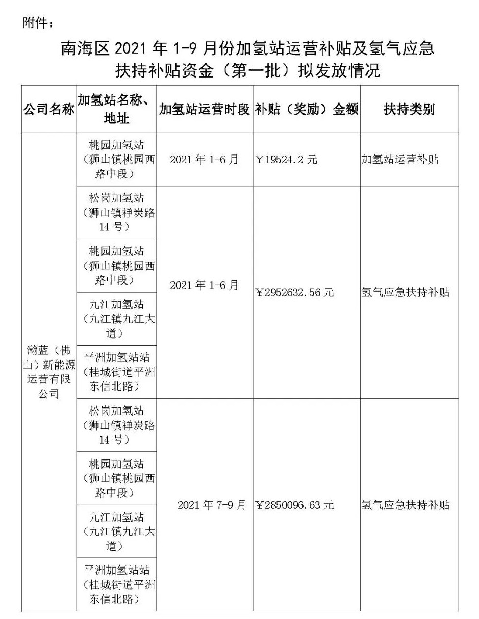 7月14日,佛山南海區(qū)發(fā)改局公布了關(guān)于南海區(qū)2021年1-9月份加氫站運(yùn)營補(bǔ)貼及氫氣應(yīng)急扶持補(bǔ)貼資金(第一批)擬發(fā)放情況的公示。