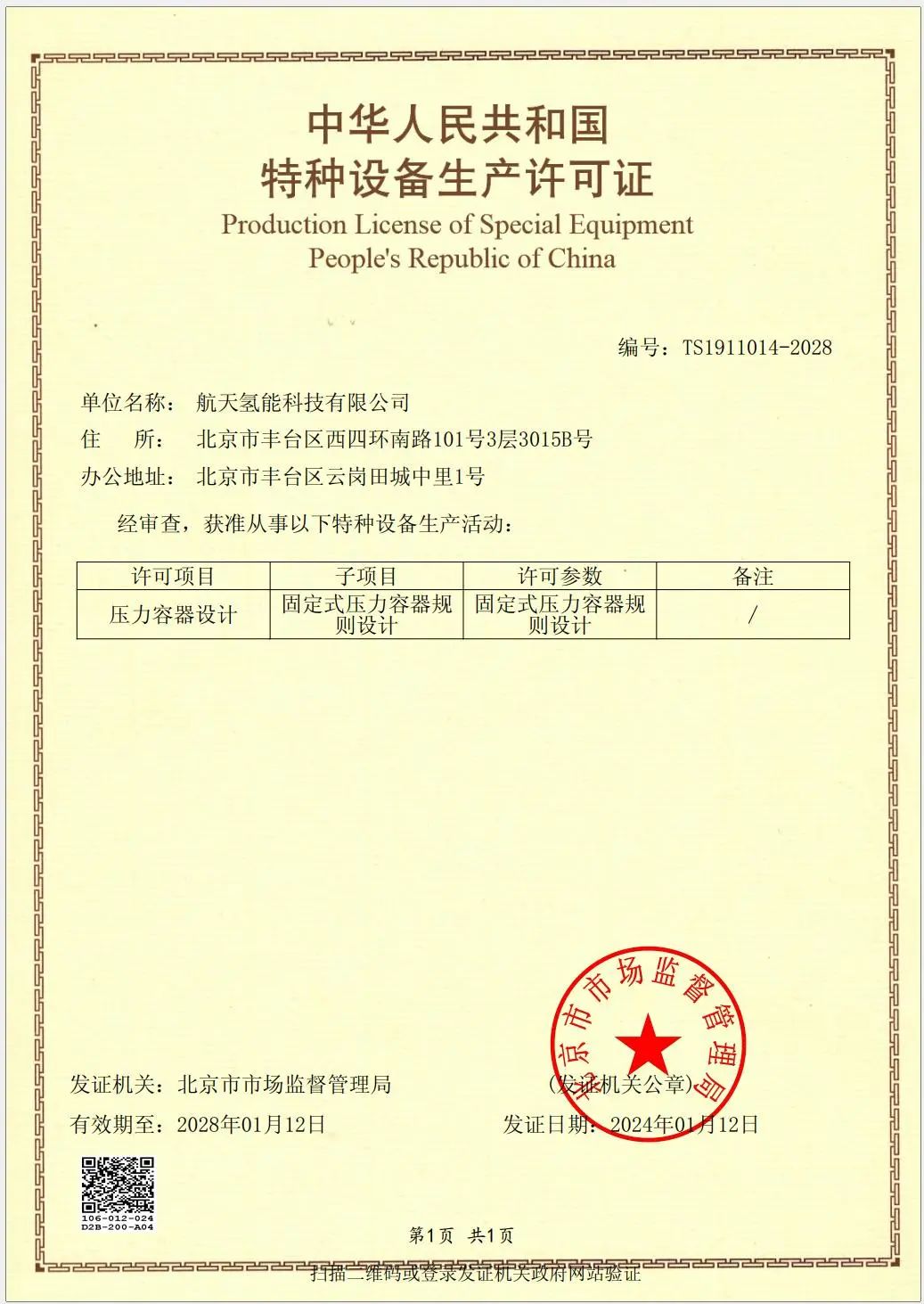 航天氫能科技有限公司順利取得“壓力容器設計-固定式壓力容器規則設計”許可證