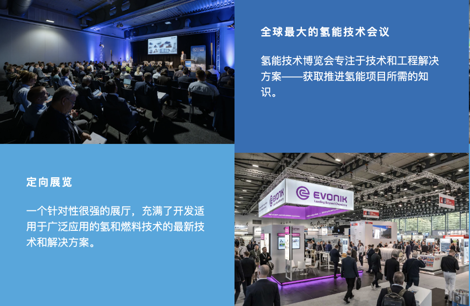 歐洲氫能技術博覽會是全球最大的提供氫能技術、材料、組件和工程解決方案的供應商展覽會,從制氫、氫能發電、儲運、加氫站及氫燃料電池汽車應用的設備貿易專場活動,重點關注低碳氫氣生產、高效儲存和分配以及各種固定和移動應用的解決方案和創新。