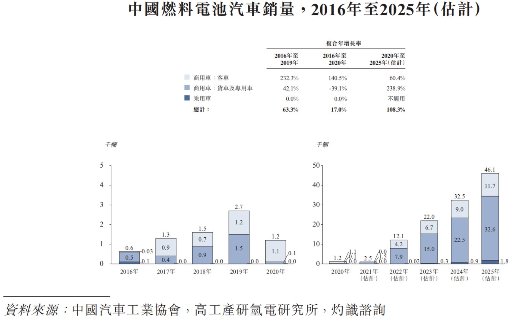 另?yè)?jù)灼識(shí)咨詢,根據(jù)2020年車用燃料電池系統(tǒng)總銷售功率計(jì)算,公司在中國(guó)電池系統(tǒng)市場(chǎng)排名第一,市場(chǎng)份額為34.8%。截至2021年9月30日,公司氫燃料電池已安裝在工信部新能源汽車目錄中的67款氫燃料電池汽車上,位居行業(yè)第一。