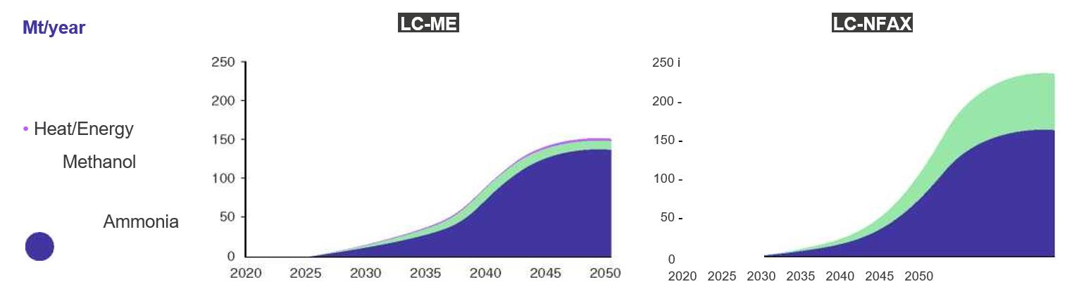 根據IEA數據顯示,到2050年,化學品產量需求將翻一番,氨的產量將增長440%,主要用于航運燃料,甲醇產量將增長330%,用于可持續塑料生產。