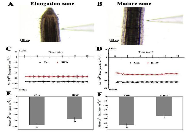 研究發現,除irt1-和zip2-突變體外,HRW預處理顯著降低了擬南芥根伸長區Cd2+內流(圖2)。HRW使WT和IRT1-和ZIP2-轉基因擬南芥(圖2G, H)的Cd2+平均內流速率從30.34 %顯著降低到34.91 %。