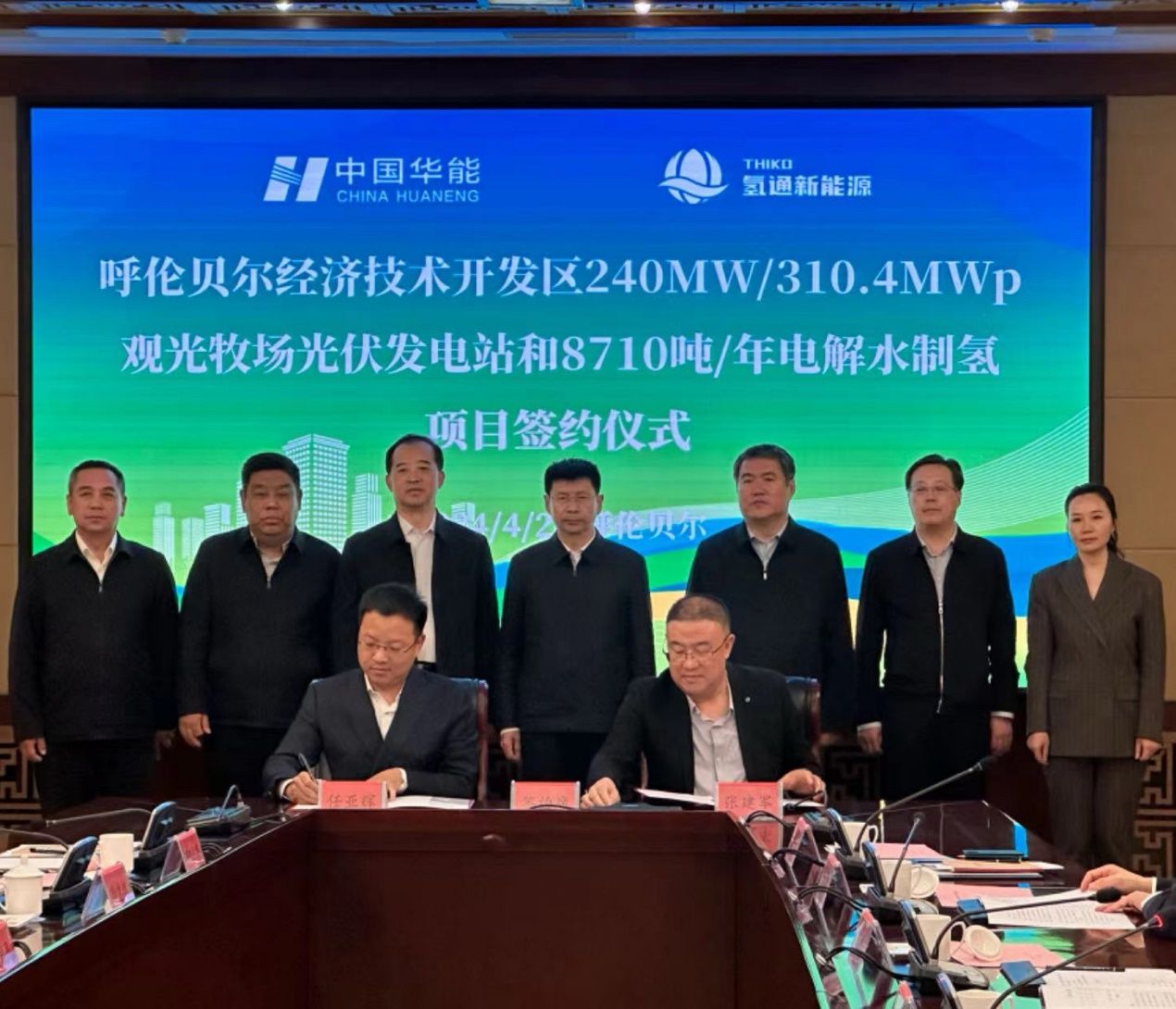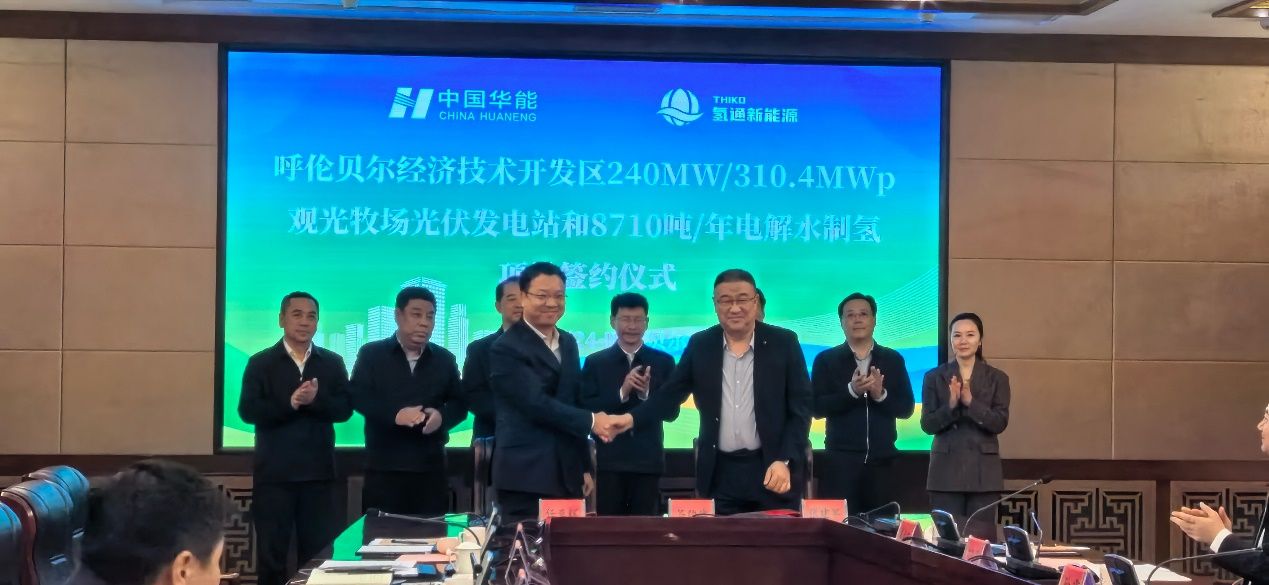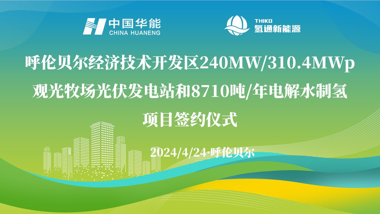 2024年4月24日下午,呼倫貝爾經濟技術開發區240MW/310.4MWp觀光牧場光伏發電站和8710噸/年電解水制氫項目簽約儀式在呼倫貝爾舉行。氫通(上海)新能源科技有限公司董事長兼CEO任亞輝、華能新能源股份有限公司廣東分公司黨委書記張建軍代表雙方公司進行簽約。呼倫貝爾市市委副書記、市長及永乾、市委常委、常務副市長胡兆民、華能新能源股份有限公司黨委副書記、總經理趙建勇、市政府秘書長徐景睿、市能源局局長何偉、呼倫貝爾經開區黨工委書記、管委會主任關繼峰、氫通(上海)新能源科技有限公司執行副總裁梁云紅見證簽約,儀式由市政府副秘書長孫立峰主持。
