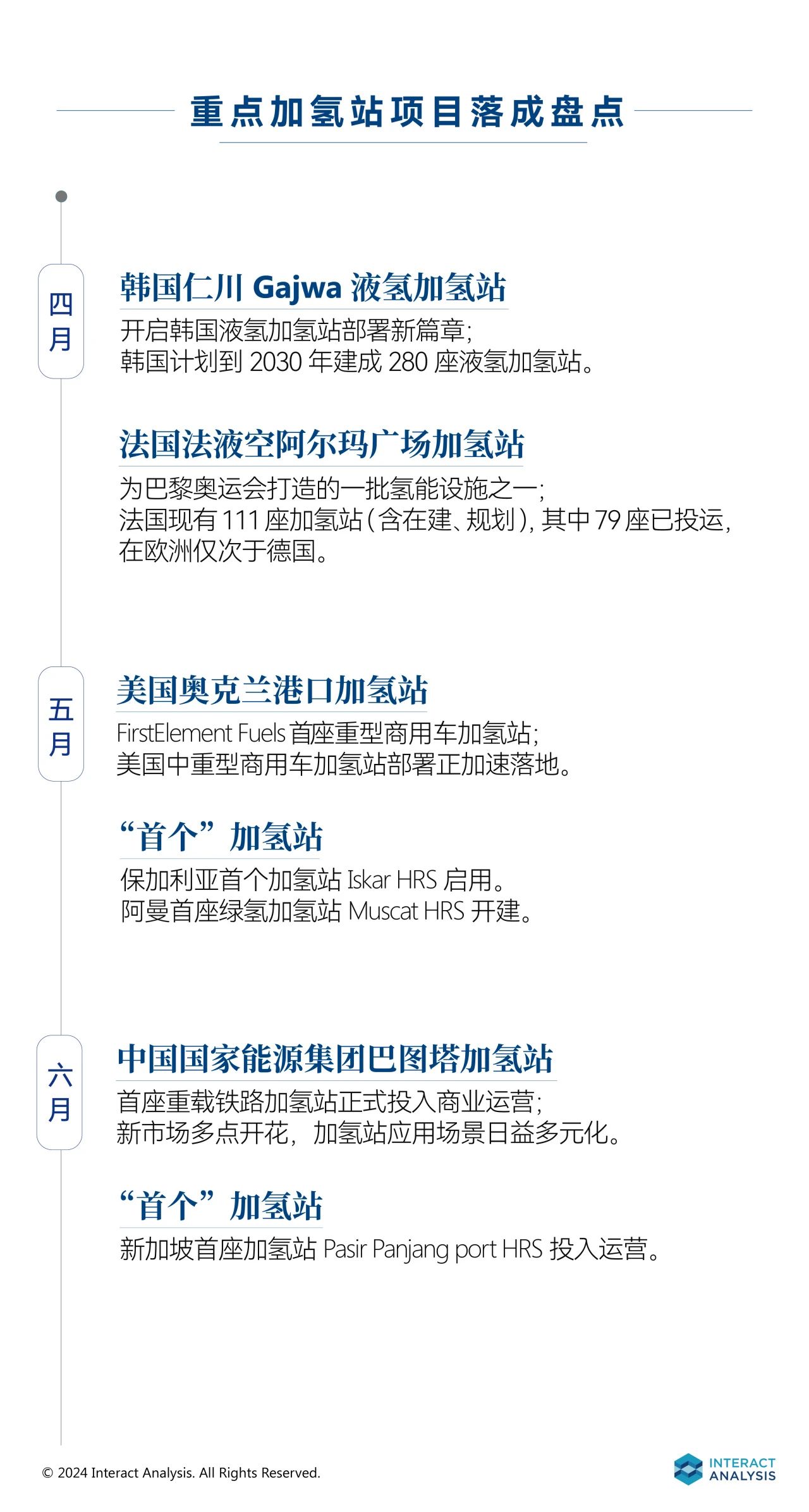 截至2024年上半年,全球41個國家與地區有加氫站落成投運,另有7個國家在規劃或建設首個(批)加氫站。但從建成數量而言,全球加氫站分布仍高度集中。目前,10個國家擁有超過10座(含10座)加氫站,占到全球總和的92%。中、韓、日、德建成加氫站數量超100座,占全球加氫站總量的72%。 亞太地區的加氫站網絡建設遠超歐美 中韓日引領亞太加氫網絡擴張。亞太地區投運的加氫站數量最多,占到全球加氫站總量的64%,其中97%的加氫站分布在中、韓、日。原本加氫站部署并駕齊驅的韓國與日本的數量差距在擴大,韓國不斷推進加氫站(特別是面向燃料電池客車)建設,今年上半年有14座新增加氫站;日本則有超10座加氫站關停(2023年至今,主要是移動式加氫站)。另外,澳新已有11座加氫站投運。 部署加氫站的歐洲國家持續增加。在歐洲、非洲及中東(EMEA)地區,超20個歐洲國家有加氫站部署,其中,德國加氫站網絡最廣,占該地區整體數量的35%,其次是法國。此外,以色列、阿聯酋、沙特也有加氫站落地。該地區加氫站投運數量在全球占比28%,在建及規劃加氫站數量占比則上升到35%,德國、法國、波蘭、挪威規劃及在建加氫站超10座。歐盟TEN-T法案(Trans-European Transport Network)的出臺很大程度上推動了加氫站在歐洲各國的部署。 美洲超3/4的加氫站在加州。該地區加氫站主要集中在美國(79座),特別是加州。值得一提的是,隨著美國“全國零排放貨運走廊規劃” (National Zero-Emission Freight Corridor Strategy)推動,德克薩斯等州也開始規劃加氫站建設,特別是面向中重型貨車的加氫設施。另外,近年來加拿大也在持續推動加氫站部署,支持氫能應用的推廣(詳見加拿大成為美洲第二大部署加氫站的國家),目前已有9座加氫站建成投運。 重點加氫站項目盤點 仁川Gajwa液氫加氫站:今年4月建成運營,開啟韓國液氫加氫站部署的新篇章。液氫加氫站正在成為韓國加氫市場關注重點。韓國規劃到2030年建成280座液氫加氫站。 法液空(Air Liquide)阿爾瑪廣場加氫站(Palace de l’Alma):今年4月落成,是為巴黎奧運會打造的一批氫能設施之一。受奧運會賽事推動,法國近年來加速氫能設施部署,目前共有111座加氫站(含在建、規劃),其中79座建成投運,在歐洲僅次于德國。 奧克蘭港口加氫站(Port of Oakland):今年5月,加州最大的加氫供應商FirstElement Fuels首座重型商用車建成,日加氫量最高可達18000kg,該站也是美國迄今為止日加注量最大的加氫站。隨著加州在特定場景禁止燃油重型車輛的法規落地,中重型商用車加氫站部署正加速落地。 國家能源集團巴圖塔加氫站:6月,我國首座重載鐵路加氫站正式投入商業運營。氫能應用場景多點開花的同時,配套加氫設施的場景日益多元化。 多國 “首個”加氫站:5月,保加利亞首個加氫站(Iskar HRS)正式啟用,阿曼首座綠氫加氫站(Muscat HRS)開始建設;6月,新加坡首座加氫站(Pasir Panjang port HRS)投入運營。