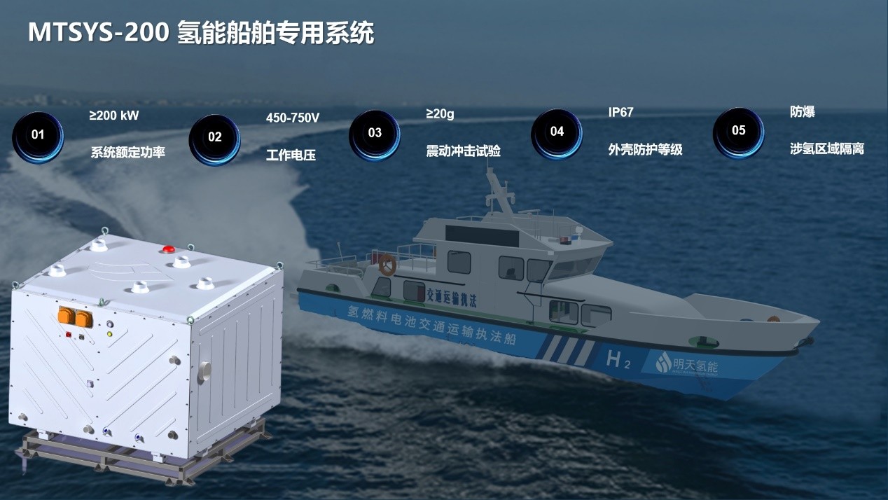 氫能船舶具有零碳環(huán)保、能量轉(zhuǎn)化效率高、模塊化程度高、運(yùn)行噪音低和維修成本低等優(yōu)勢,已成為新能源船舶的主要研發(fā)與產(chǎn)業(yè)化方向。明天氫能公司成立以來,不斷拓展燃料電池示范應(yīng)用場景,高度重視氫能船舶動(dòng)力開發(fā)與場景示范。2024世界制造業(yè)大會(huì),明天氫能發(fā)布新一代200kW級(jí)船舶專用燃料電池系統(tǒng),在船用燃料電池高性能膜電極、長壽命雙極板、高比功率電堆及船用動(dòng)力系統(tǒng)的控制模塊與軟件系統(tǒng)的設(shè)計(jì)方面,全面迭代升級(jí)。