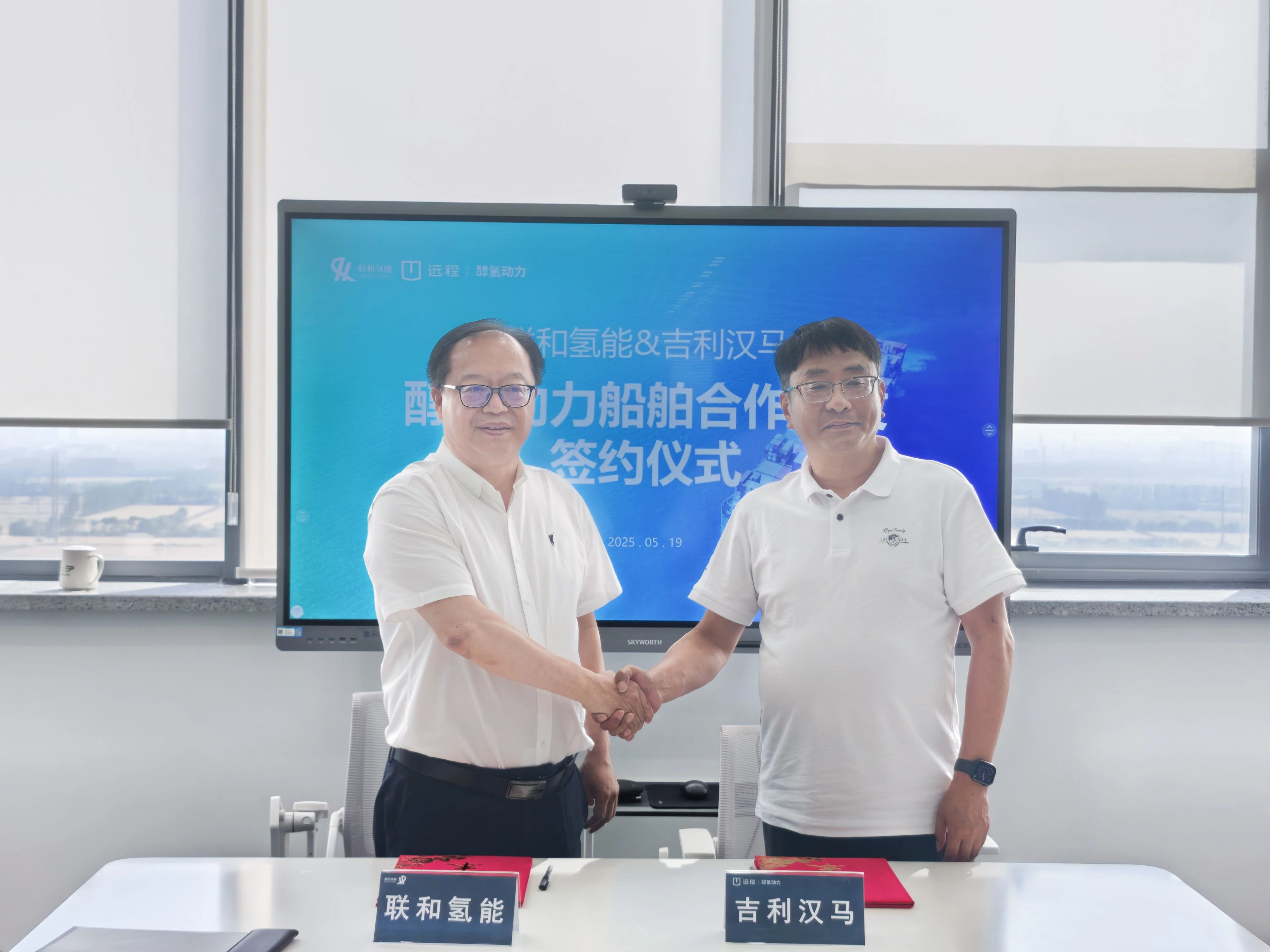 5月19日,聯(lián)和氫能與吉利漢馬醇?xì)鋭恿Υ昂献鏖_發(fā)簽約儀式在聯(lián)和氫能嘉興全球總部隆重舉行,這一里程碑事件標(biāo)志著兩家行業(yè)領(lǐng)軍企業(yè)正式攜手,將為全球綠色航運(yùn)提供 “中國方案”。