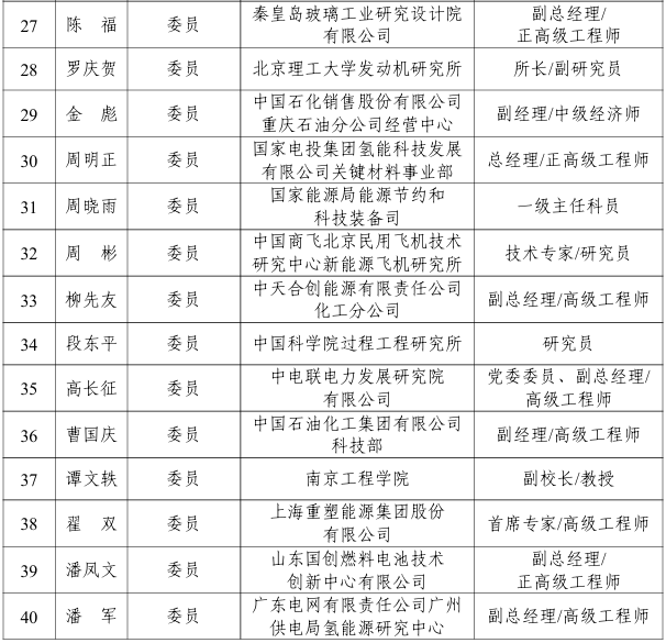 能源行業氫能基礎與通用標準化技術委員會編號為NEA/TC 48,負責能源行業氫能基礎與通用標準體系研究,具體承擔氫能基礎共性要求、術語定義、氫品質、評價體系等方面的標準化工作,第一屆能源行業氫能基礎與通用標準化技術委員會由38名委員組成,委員名單如下:
