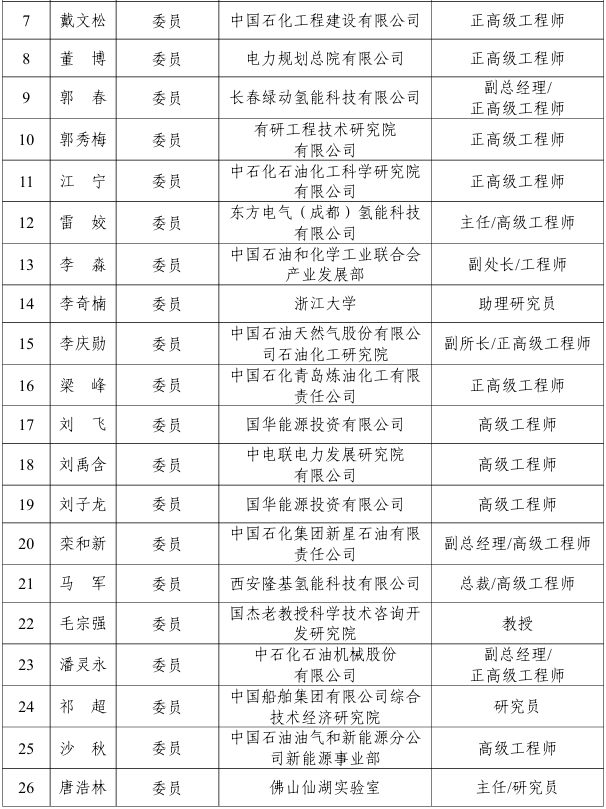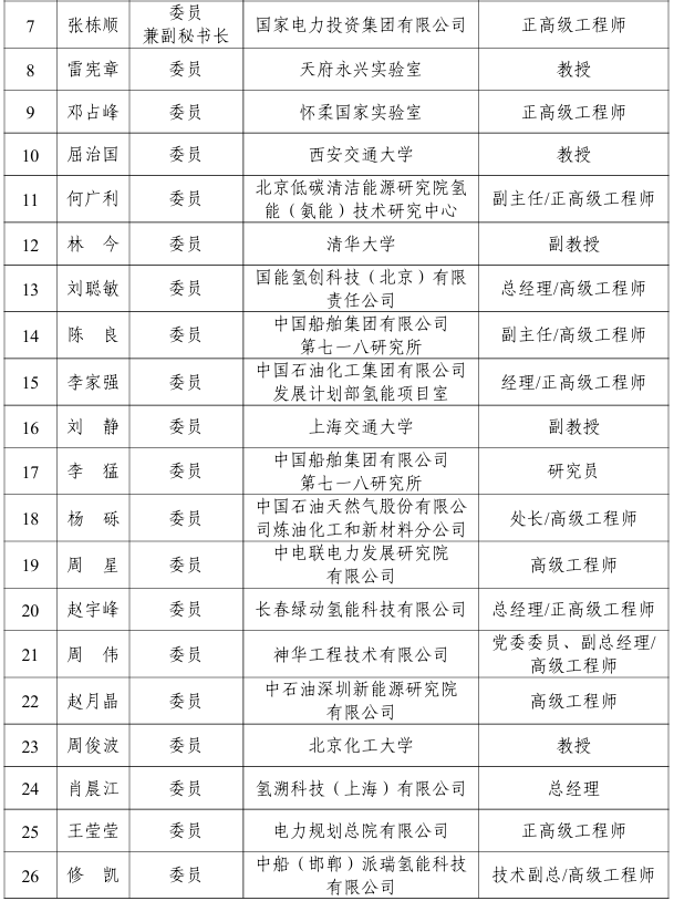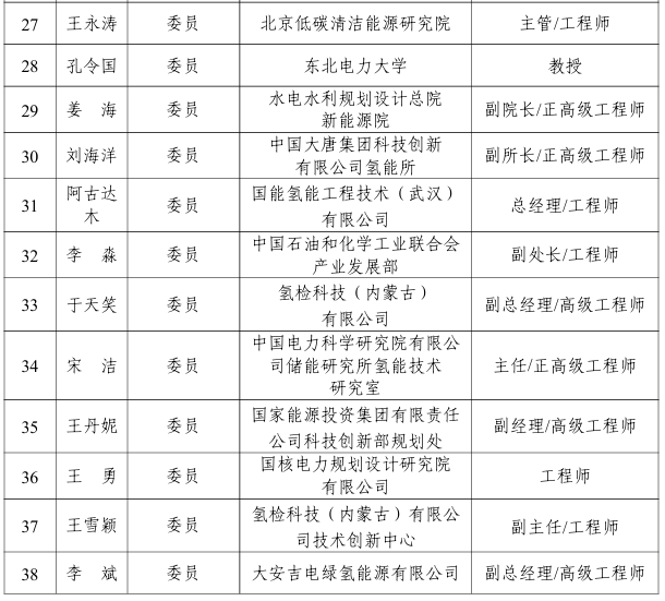 能源行業氫能制取標準化技術委員會編號為NEA/TC 49,負責能源行業氫能制取標準體系研究,具體承擔電解水制氫、可再生能源制氫、光解水制氫、化石能源制氫、其他制氫、天然氫和氫分離與提純等氫能制取方面的標準化工作,第一屆能源行業氫能制取標準化技術委員會由38名委員組成,委員名單如下: