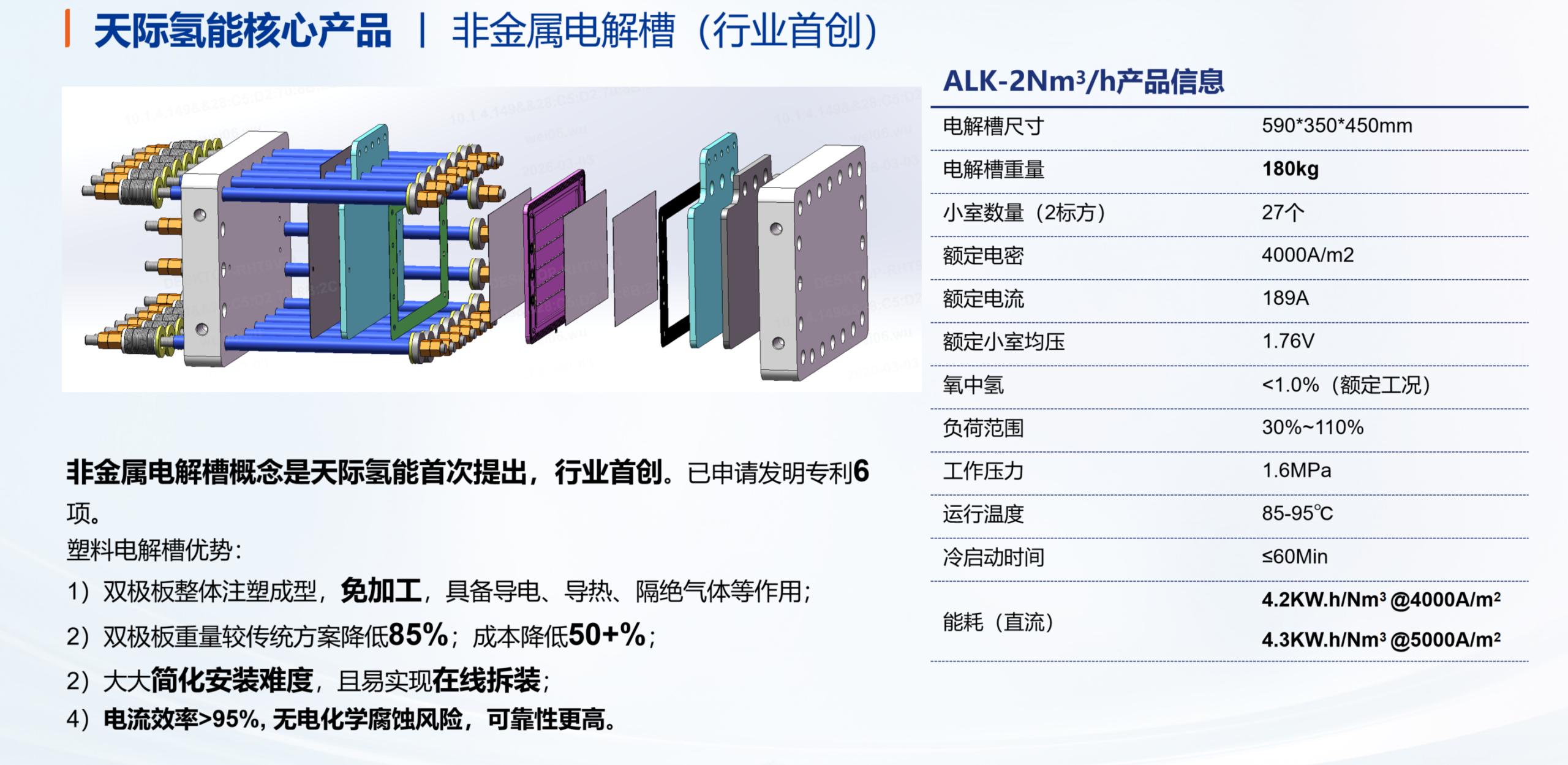 天際氫能非金屬電解槽小模型樣機(以ALK-2Nm3/h為核心驗證載體),通過系統性測試驗證了核心技術優勢: