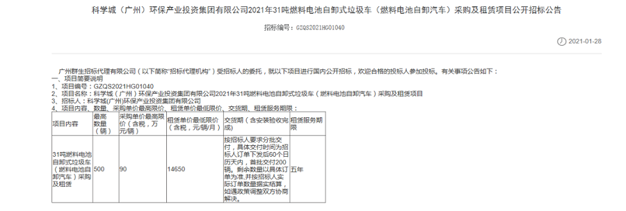 2月4日,氫云鏈從廣州群生招標代理有限公司官網(wǎng)獲悉,科學城(廣州)環(huán)保產(chǎn)業(yè)投資集團有限公司發(fā)布31噸燃料電池自卸式垃圾車(燃料電池自卸汽車)采購及租賃項目招標公告。