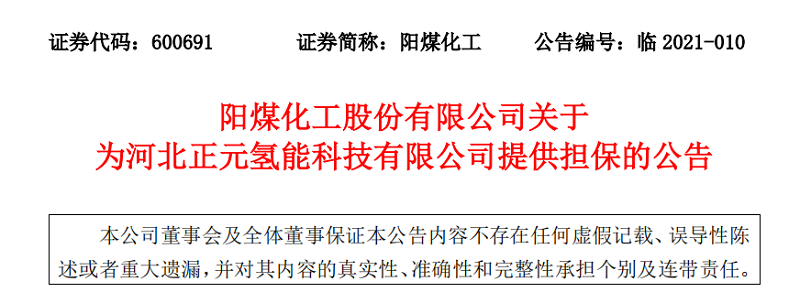 3月9日下午,陽煤化工股份有限公司(以下簡稱“陽煤化工”)發布為全資子公司河北正元氫能科技有限公司(以下簡稱“正元氫能”)提供擔保的公告。