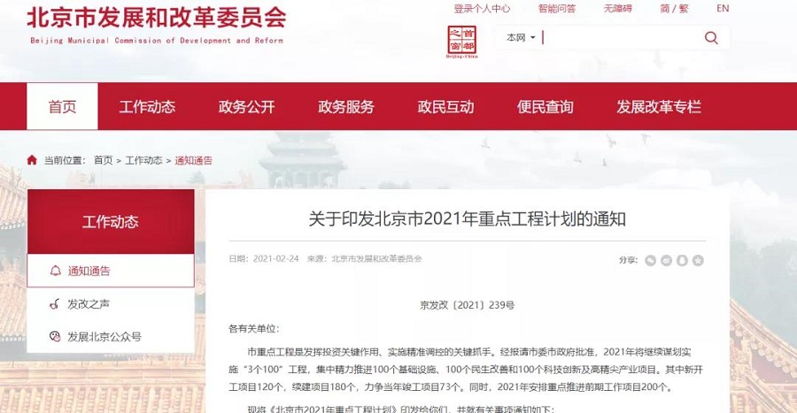 近日,根據(jù)北京市發(fā)改委官網(wǎng)信息公示,北京市發(fā)改委、北京市住建委聯(lián)合印發(fā)北京市2021年重點(diǎn)工程計(jì)劃,根據(jù)計(jì)劃,北京市2021年將繼續(xù)謀劃實(shí)施“3個(gè)100”工程,集中精力推進(jìn)100個(gè)基礎(chǔ)設(shè)施、100個(gè)民生改善和100個(gè)科技創(chuàng)新及高精尖產(chǎn)業(yè)項(xiàng)目。其中新開工項(xiàng)目120個(gè),續(xù)建項(xiàng)目180個(gè),力爭(zhēng)當(dāng)年竣工項(xiàng)目73個(gè)。同時(shí),2021年安排重點(diǎn)推進(jìn)前期工作項(xiàng)目200個(gè)。