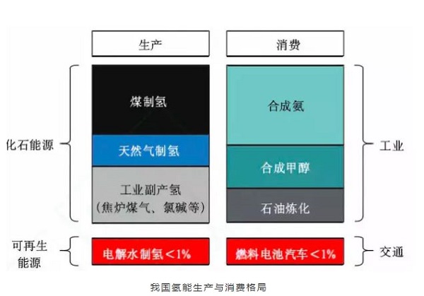 在生產與消費方面,我國已具備一定氫能工業基礎,全國氫氣產能超過2000萬t/a,但生產主要依賴化石能源,消費主要作為工業原料,清潔能源制氫和氫能的能源化利用規模較小。國內由煤、天然氣、石油等化石燃料生產的氫氣占了將近70%,工業副產氣體制得的氫氣約占30%,電解水制氫占不到1%。國內外能源企業結合其各自優勢選擇不同技術路線,紛紛布局氫能源生產與供給,煤制氫、天然氣制氫、堿性電解水制氫技術和設備已具備商業化推廣條件。