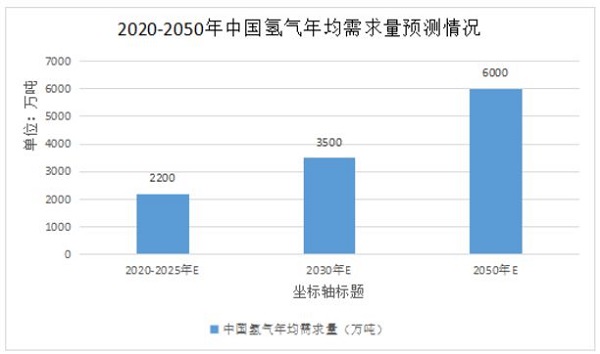 整體而言,中國氫能市場發展初期(2020-2025年左右),氫氣年均需求約2200萬噸;氫能市場發展中期(2030年左右),氫氣年均需求約3500萬噸;氫能市場發展遠期(2050年左右),氫氣年均需求約6000萬噸。