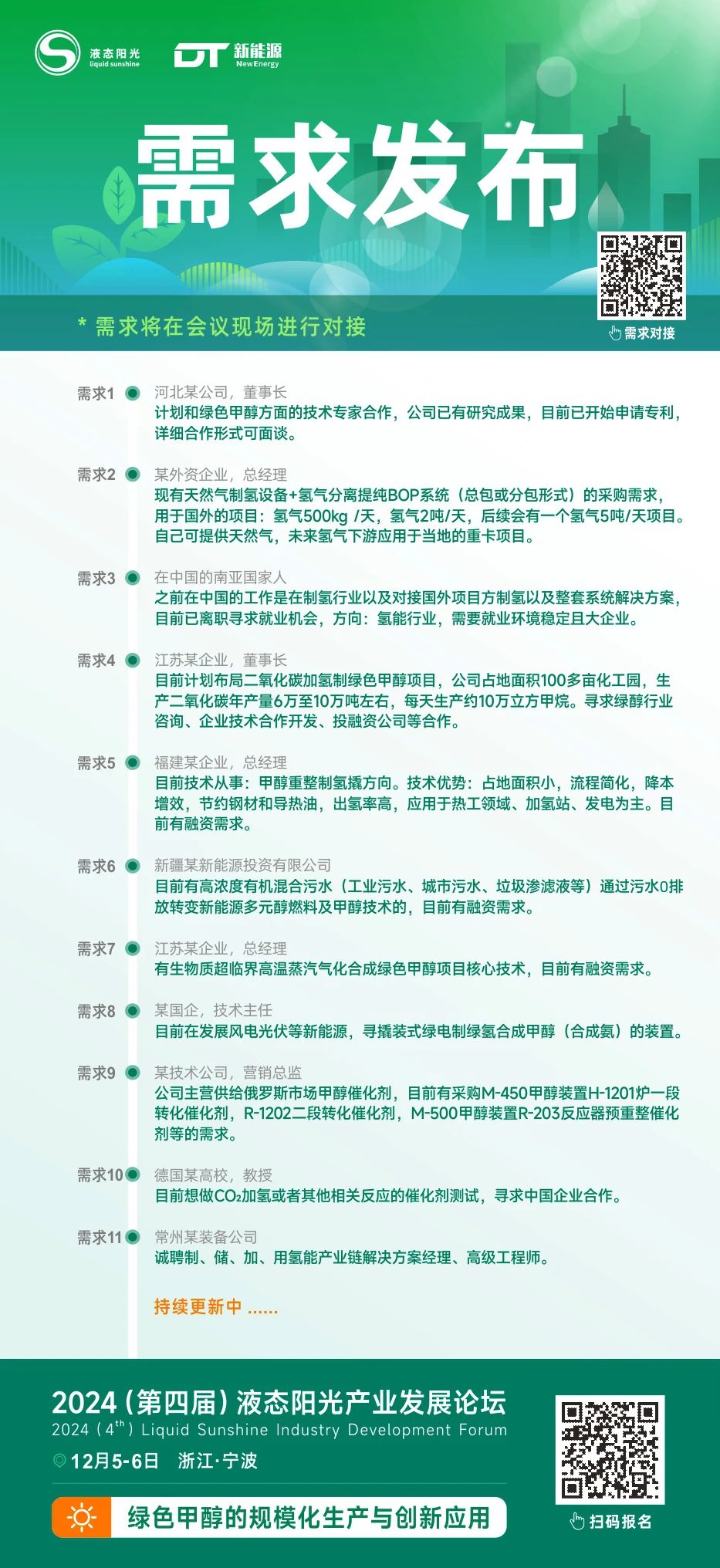 為疏通液態陽光產業之間“供需關系”,打通科技成果轉移轉化、人才對接等“供應鏈”,此次會議特針對液態陽光產業所涉及的科研機構及研究院、企業、政府和第三方服務機構等的群體,推出“供需對接收集表”。