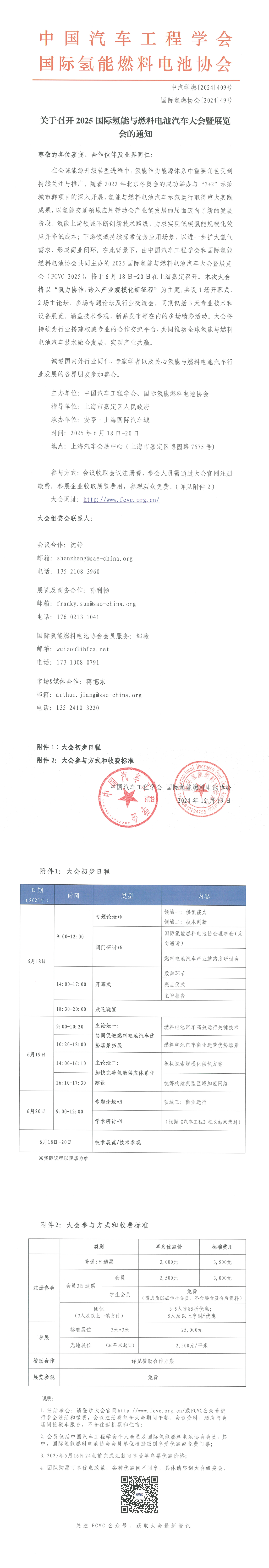 FCVC 2025 尊敬的各位嘉賓、合作伙伴及業(yè)界同仁: 在全球能源升級轉(zhuǎn)型進(jìn)程中,氫能作為能源體系中重要角色受到持續(xù)關(guān)注與推廣。隨著2022年北京冬奧會(huì)的成功舉辦與“3+2”示范城市群項(xiàng)目的深入開展,氫能與燃料電池汽車示范運(yùn)行取得重大實(shí)踐成果,以氫能交通領(lǐng)域應(yīng)用帶動(dòng)全產(chǎn)業(yè)鏈發(fā)展的局面邁向了新的發(fā)展階段。氫能上游領(lǐng)域不斷創(chuàng)新技術(shù)路線,力求實(shí)現(xiàn)低碳?xì)淠芤?guī)模化效應(yīng)并降低成本;下游領(lǐng)域持續(xù)探索優(yōu)勢應(yīng)用場景,以進(jìn)一步擴(kuò)大氫氣需求、形成商業(yè)閉環(huán)。在此背景下,由中國汽車工程學(xué)會(huì)和國際氫能燃料電池協(xié)會(huì)共同主辦的2025國際氫能與燃料電池汽車大會(huì)暨展覽會(huì)(FCVC 2025),將于6月18日-20日在上海嘉定召開。本次大會(huì)將以“氫力協(xié)作,跨入產(chǎn)業(yè)規(guī)模化新征程”為主題,共設(shè)1場開幕式、2場主論壇、多場專題論壇及行業(yè)交流會(huì),同期包括3天專業(yè)技術(shù)和設(shè)備展覽,涵蓋技術(shù)參觀、新品發(fā)布等在內(nèi)的多場精彩活動(dòng)。大會(huì)將持續(xù)為行業(yè)搭建權(quán)威專業(yè)的合作交流平臺(tái),共同推動(dòng)全球氫能與燃料電池汽車技術(shù)融合發(fā)展,實(shí)現(xiàn)產(chǎn)業(yè)共贏。 誠邀國內(nèi)外行業(yè)同仁、專家學(xué)者以及關(guān)心氫能與燃料電池汽車行業(yè)發(fā)展的各界朋友參加盛會(huì)。 組織機(jī)構(gòu) 主辦單位:中國汽車工程學(xué)會(huì)、國際氫能燃料電池協(xié)會(huì) 指導(dǎo)單位:上海市嘉定區(qū)人民政府 承辦單位:安亭·上海國際汽車城 時(shí)間及地點(diǎn) 時(shí)間:2025年6月18日-20日 地點(diǎn):上海汽車會(huì)展中心(上海市嘉定區(qū)博園路7575號) 大會(huì)初步日程 技術(shù)展覽概況 FCVC 2025技術(shù)展覽展出面積將達(dá)25,000㎡,預(yù)計(jì)300+國內(nèi)外企業(yè)和品牌將參與展示,觀眾規(guī)模將達(dá)15,000人以上。 展品范圍:氫燃料電池整車及其他應(yīng)用端(船舶、航空航天、無人機(jī)等)、氫氣生產(chǎn)/供應(yīng)、氫氣儲(chǔ)存/運(yùn)輸、加氫站及加氫相關(guān)設(shè)備、氫能端相關(guān)設(shè)備及零部件、燃料電池系統(tǒng)及電堆、燃料電池電堆零部件和原材料、測試平臺(tái)&系統(tǒng)及設(shè)備,分析儀器以及檢測、認(rèn)證、咨詢等其他相關(guān)配套服務(wù)。 參與方式及收費(fèi)標(biāo)準(zhǔn) 說明: 1.注冊參會(huì):請登錄大會(huì)官網(wǎng)http://www.fcvc.org.cn/或FCVC公眾號進(jìn)行參會(huì)注冊和繳費(fèi),參會(huì)&參觀注冊系統(tǒng)將于1月中旬上線,會(huì)議注冊費(fèi)包含大會(huì)期間午餐、會(huì)議資料、酒店與會(huì)場間接駁車服務(wù),不含往返機(jī)票和住宿; 2.會(huì)員包括中國汽車工程學(xué)會(huì)個(gè)人會(huì)員及國際氫能燃料電池協(xié)會(huì)會(huì)員,其中,國際氫能燃料電池協(xié)會(huì)會(huì)員單位根據(jù)級別享受優(yōu)惠或免費(fèi)門票; 3.2025年5月16日24點(diǎn)前完成匯款可享受早鳥票優(yōu)惠價(jià)格; 4.團(tuán)隊(duì)購票可享優(yōu)惠政策,各種優(yōu)惠間不同享,具體請咨詢大會(huì)組委會(huì)。 大會(huì)組委會(huì)聯(lián)系人 會(huì)議演講:沈錚 郵箱:shenzheng@sae-china.org 電話:135 2108 3960 展覽及商務(wù)合作:孫利暢 郵箱:franky.sun@sae-china.org 電話:176 0213 1041 國際氫能燃料電池協(xié)會(huì)會(huì)員服務(wù):鄒薇 郵箱:weizou@ihfca.net 電話:173 1008 0791 市場&媒體合作:蔣憓東 郵箱:arthur.jiang@sae-china.org 電話:135 2410 3220 查看FCVC 2025大會(huì)通知紅頭文件