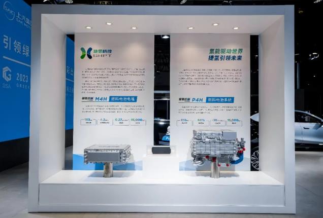 碳博會現場,由捷氫科技自主研發的PROME M4H燃料電池電堆、P4H燃料電池系統、全新一代膜電極等拳頭產品,以及搭載捷氫科技產品的燃料電池MPV上汽大通MIFA氫等創新成果悉數亮相,并通過展品、展板、多媒體等形式呈現了上海市燃料電池汽車示范應用項目階段性成果。