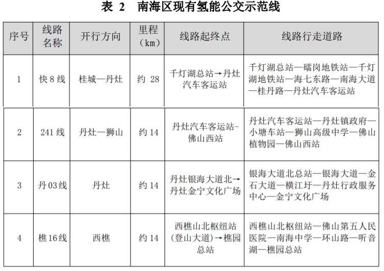 目前,南海區(qū)已登記上牌 440 輛氫能車輛,其中物流車426 輛、公交車 11 輛、小型客車 3 輛;已開通了快 8 線(千燈湖總站→丹灶汽車客運(yùn)站)、241 線(丹灶汽車客運(yùn)站→佛山西站)、丹 03 線(丹灶銀海大道北→丹灶金寧文化廣場)、樵 16 線(西樵山北樞紐站(登山大道)→樵園總站)等 4 條氫能公交示范線路(見表 2)。到 2020 年,南海區(qū)計(jì)劃投入 400 多輛氫能公交,按每條公交線配置 20 輛氫能公交車計(jì)算,將要開通 20 條以上公交線,覆蓋南海區(qū)所有的 7個(gè)鎮(zhèn)(街道)。